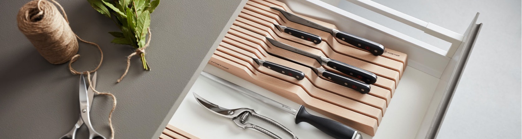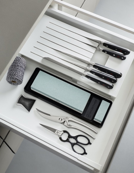 Noże, podstawowe narzędzia w kuchni, powinny mieć przeznaczone specjalne miejsce, z dala od innych przedmiotów czy akcesoriów kuchennych. Często nóż przechowuje się w szufladzie pośród innych akcesoriów kuchennych. Nie jest to dobre rozwiązanie, ponieważ ocierające i odbijające się o siebie przyrządy niekorzystnie wpływają na jakość ostrza. Jeśli jednak chcemy pozostać przy przechowywaniu noży w szufladzie, to polecamy specjalne organizery, które odpowiednio je zabezpieczą. Organizer do szuflady WÜSTHOF to idealny sposób na przechowywanie noży bez zajmowania cennego miejsca na blacie roboczym. Wykonany z europejskiego drewna bukowego, utrzymuje noże w stabilnej pozycji, zapobiegając uszkodzeniu ostrza czy rękojeści.