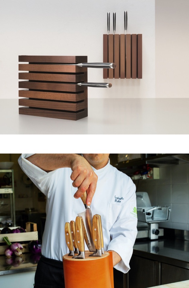 Innym, wygodnym rozwiązaniem są listwy magnetyczne oraz drewniane bloki magnetyczne lub wykonane z innych materiałów bloki na noże ze specjalnymi otworami.